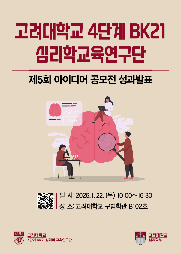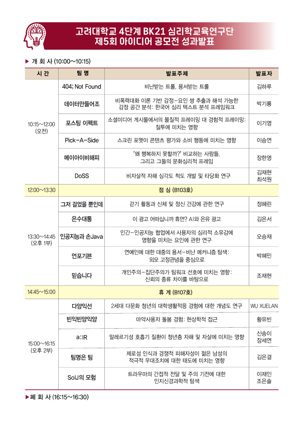 저희 고려대학교 4단계 BK21 심리학교육연구단에서는 제5회 아이디어 공모전 성과 발표 행사를 아래와 같이 진행합니다.